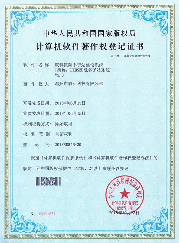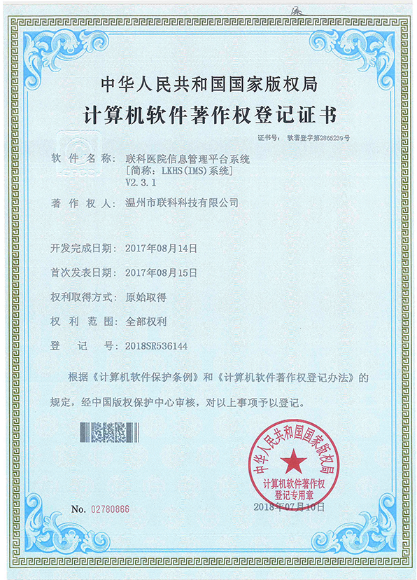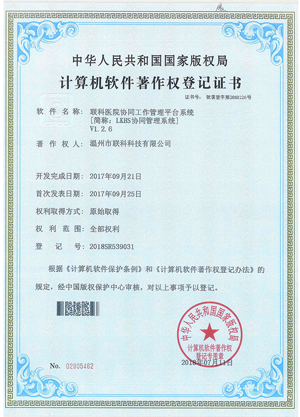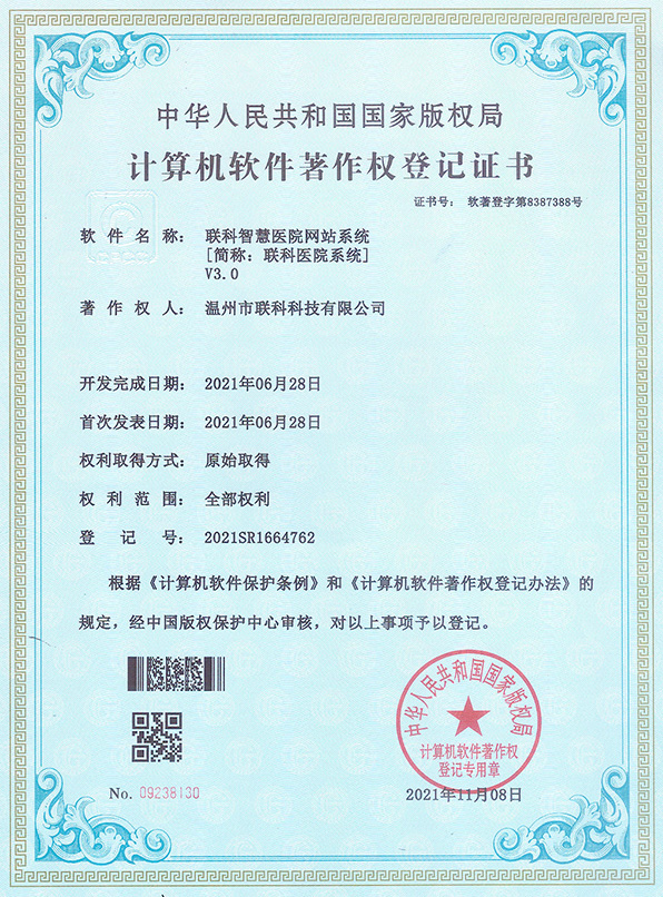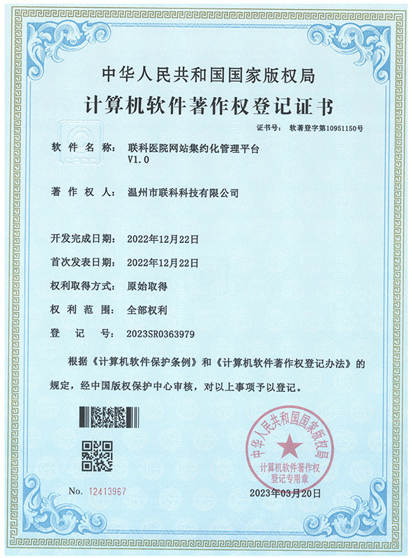 聯(lián)科醫(yī)院網(wǎng)站集約化管理平臺V1.0登記證書(2022R11L2489282)