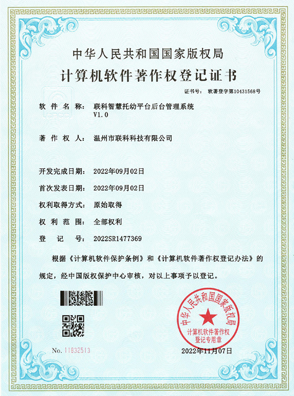 聯(lián)科智慧托幼平臺老師客戶端軟件V1.0登記證書(2022R11L2332140)