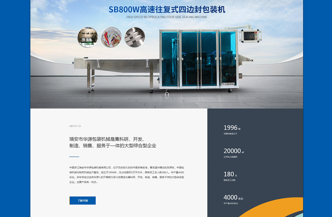 中國·浙江瑞安市華源包裝機械有限公司,位于歷史悠久的的中國“浙南名城”,“溫州模式”的發(fā)源地,中國包裝機械與制藥機械生產(chǎn)基地,成立于1996年,總占地面積2萬平方米,擁有員工總人數(shù)180人。年產(chǎn)量4000余臺。多年來經(jīng)過全體華源人的不懈努力現(xiàn)今發(fā)展成為集科研、開發(fā)、制造、銷售、服務于—體的大型綜合型企業(yè)。