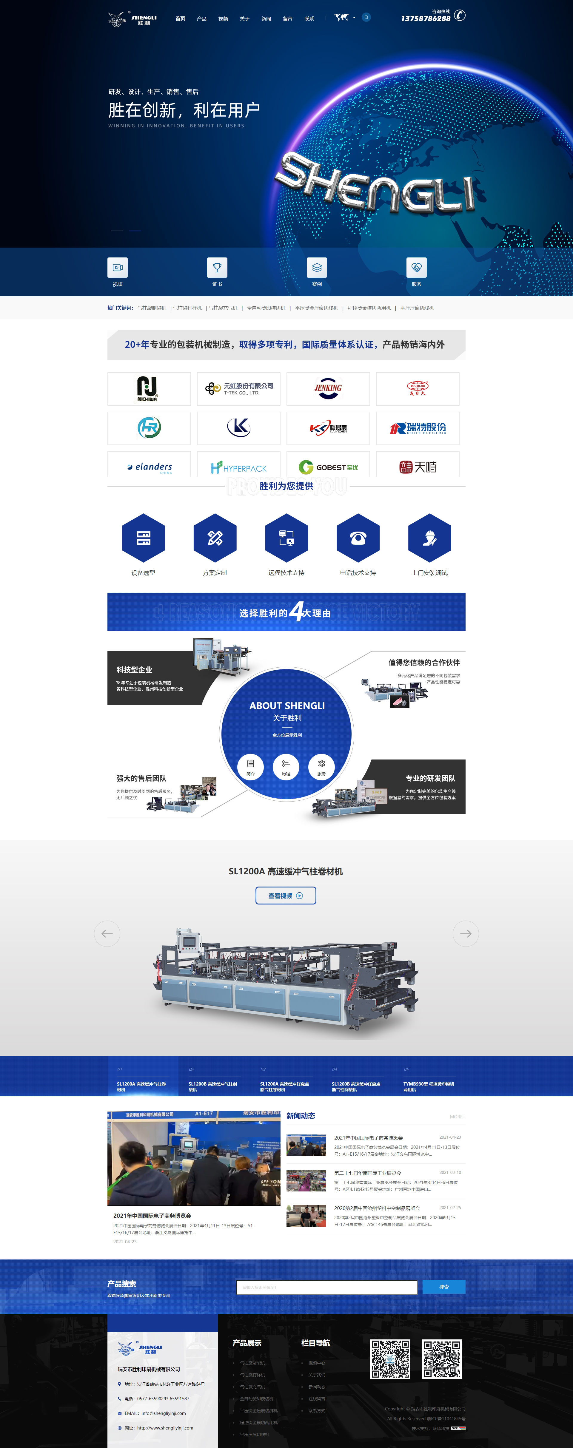 瑞安市勝利印刷機(jī)械有限公司,成立于1993年,是一家有著幾十年機(jī)械制造經(jīng)驗(yàn),集研發(fā)、設(shè)計、生產(chǎn)、銷售和售后服務(wù)為一體的科技綜合型企業(yè),在同行業(yè)中處于較好水平。公司技術(shù)力量雄厚、生產(chǎn)裝備精良、工藝技術(shù)先進(jìn)、測試手段完備,專業(yè)生產(chǎn)高速緩沖氣柱卷材機(jī)、高速緩沖氣柱制袋機(jī)、高速緩沖任意點(diǎn)斷氣柱卷材機(jī)、高速緩沖任意點(diǎn)斷氣柱制袋機(jī)、高速無氣閥充氣鞋撐機(jī)、高速一出二緩沖氣柱任意點(diǎn)斷卷材機(jī)、高速氣柱氣枕葫蘆墊鞋撐一體機(jī)、冰袋機(jī)、袋中袋機(jī)、緩沖袋充氣機(jī)、緩沖袋打樣機(jī)、全自動燙印模切兩用機(jī)、程控燙印模切兩用機(jī)、燙