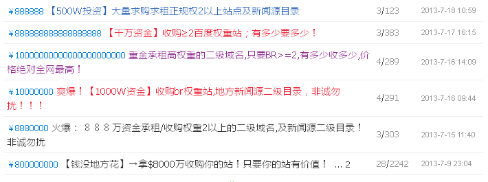 2013年7月19日百度網(wǎng)頁(yè)搜索反作弊團(tuán)隊(duì)對(duì)于一些論壇出現(xiàn)大量的高價(jià)收購(gòu)二級(jí)域名或目錄的信息,絕大部分被用于作弊,例如:太原新聞網(wǎng),出售二級(jí)目錄被用于作弊。對(duì)于此類出售二級(jí)域名二級(jí)目錄的問題,將進(jìn)行嚴(yán)厲的懲罰,株連至整個(gè)站點(diǎn),直接屏蔽并清理出百度新聞源。