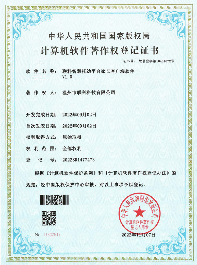《聯(lián)科智慧托幼平臺家長客戶端軟件V1.0》于2022年11月07日被正式授予《中華人民共和國國家版權(quán)局計(jì)算機(jī)軟件著作權(quán)登記證書》,登記號為2020SR1477473。
