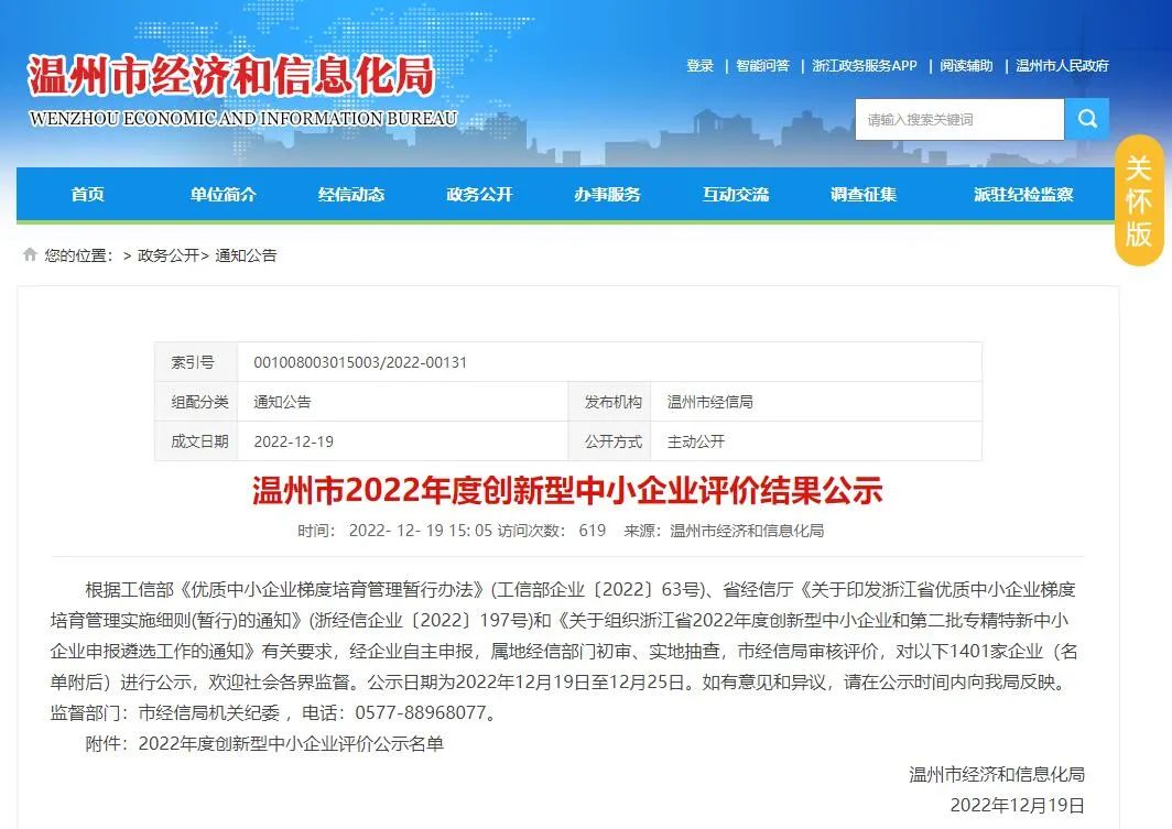 根據(jù)溫州市經(jīng)濟(jì)和信息化局于2022年12月19日發(fā)布的《溫州市2022年度創(chuàng)新型中小企業(yè)評價結(jié)果公示》顯示,溫州市聯(lián)科科技有限公司成功入選2022年度溫州市創(chuàng)新型中小企業(yè)名單。