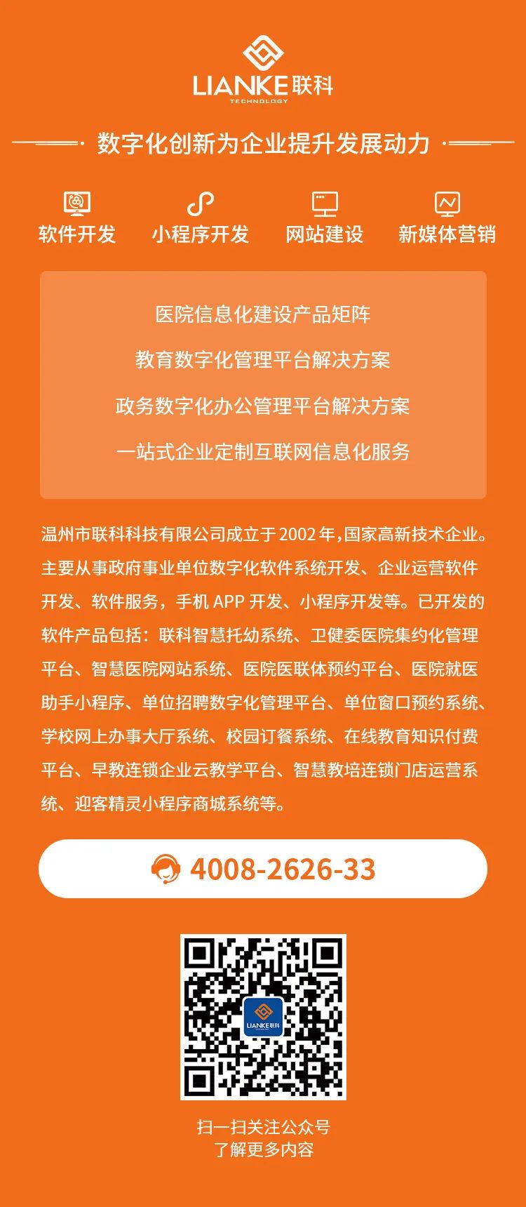 海報是醫(yī)院傳播信息的一種重要方式。聯(lián)科科技擁有一支專業(yè)且富有創(chuàng)意的設(shè)計團隊,為了使用戶更加方便地獲取信息,海報設(shè)計得清晰明了。海報采用簡潔的顏色和字體,避免了過多的信息堆砌,方便了用戶快速獲取關(guān)鍵信息。同時,海報突出宣傳重點,例如醫(yī)院的特色科室、最新的醫(yī)療技術(shù)等,直觀吸引用戶關(guān)注。