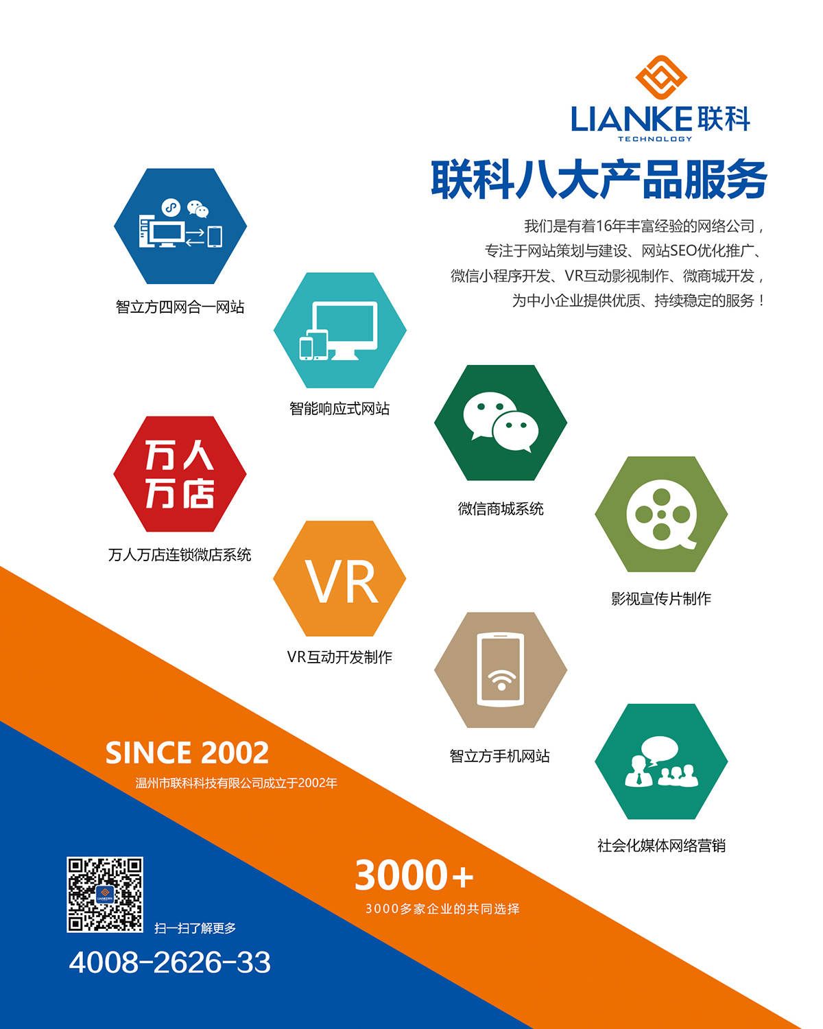 溫州市聯(lián)科科技有限公司成立于2002年,從業(yè)16年以來專注于互聯(lián)網(wǎng)技術服務,致力于為中國的成長型企業(yè)提供電子商務整體解決方案,為3000多家中小微企業(yè)提供互聯(lián)網(wǎng)基礎服務、網(wǎng)站建設、微信小程序開發(fā)、網(wǎng)絡營銷推廣、電子商務平臺系統(tǒng)開發(fā)等服務。時代在不斷變化,新技術窮出不盡,互聯(lián)網(wǎng)對企業(yè)的用途,從原來的網(wǎng)站建設、網(wǎng)絡營銷推廣到電子商務平臺交易,從PC互聯(lián)網(wǎng)到移動互聯(lián)網(wǎng),都在不斷迭代升級。做為一家互聯(lián)網(wǎng)第三方技術服務公司,聯(lián)科一直把技術創(chuàng)新做為公司發(fā)展的重要任務去抓,不斷推出適應企業(yè)發(fā)展的新技術、新產品、新服務,包括四網(wǎng)合一網(wǎng)站系統(tǒng)、響應式網(wǎng)站系統(tǒng)、智立方SEO推廣系統(tǒng)、微信分銷商城系統(tǒng)、萬人萬店連鎖微店系統(tǒng)等。