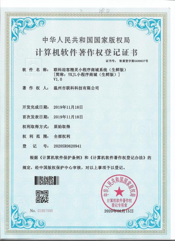 《聯(lián)科迎客精靈小程序商城系統(tǒng)(生鮮版)V1.0》于2020年06月15日被正式授予《中華人民共和國國家版權(quán)局計(jì)算機(jī)軟件著作權(quán)登記證書》,登記號(hào)為2020SR0620941。