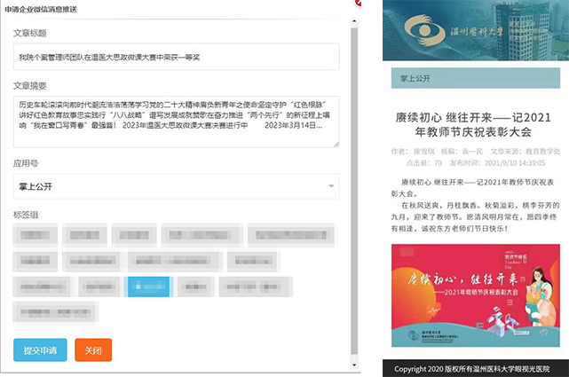在醫(yī)院內(nèi)容管理系統(tǒng)基礎上開發(fā)一套接入企業(yè)微信的系統(tǒng)。能夠?qū)?nèi)容管理系統(tǒng)中的文章推送到企業(yè)微信指定的應用號中??蛇x不同應用,不同用戶標簽做到信息資源的定向推送。擁有審核機制,普通用戶申請推送,管理員審核通過后發(fā)起企業(yè)微信消息推送。極大改善了普通信息資源發(fā)布后用戶被動閱讀的弊端。